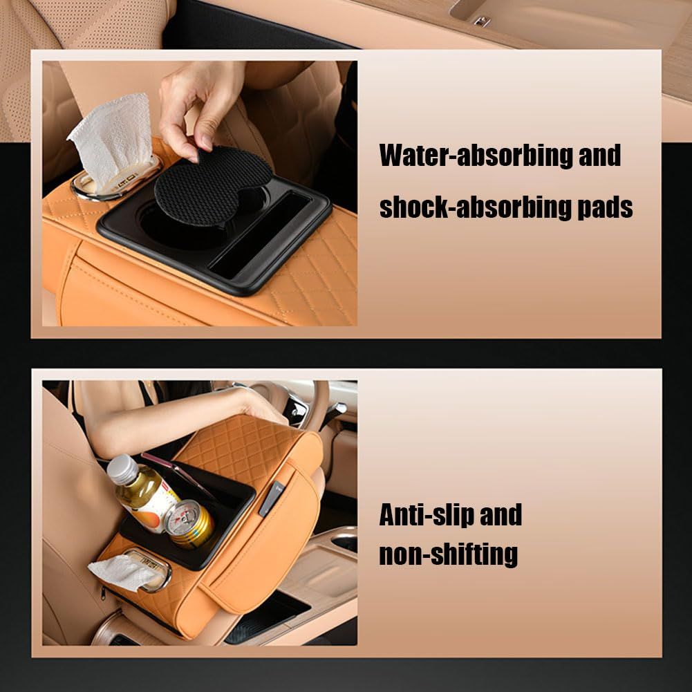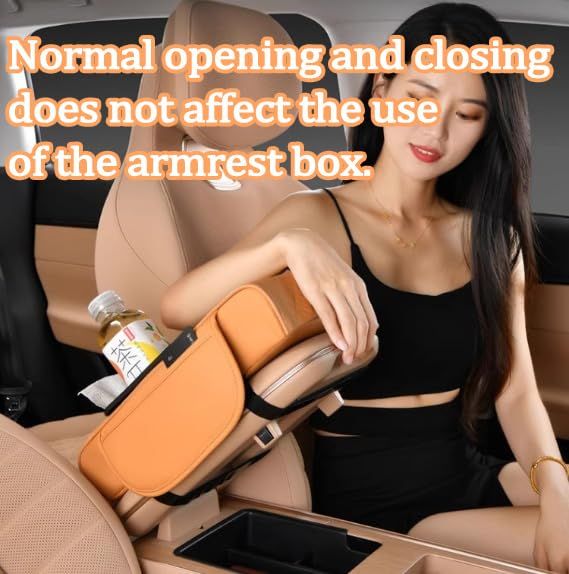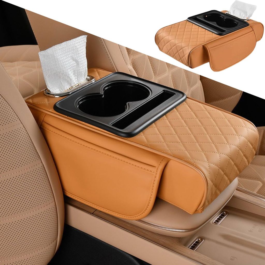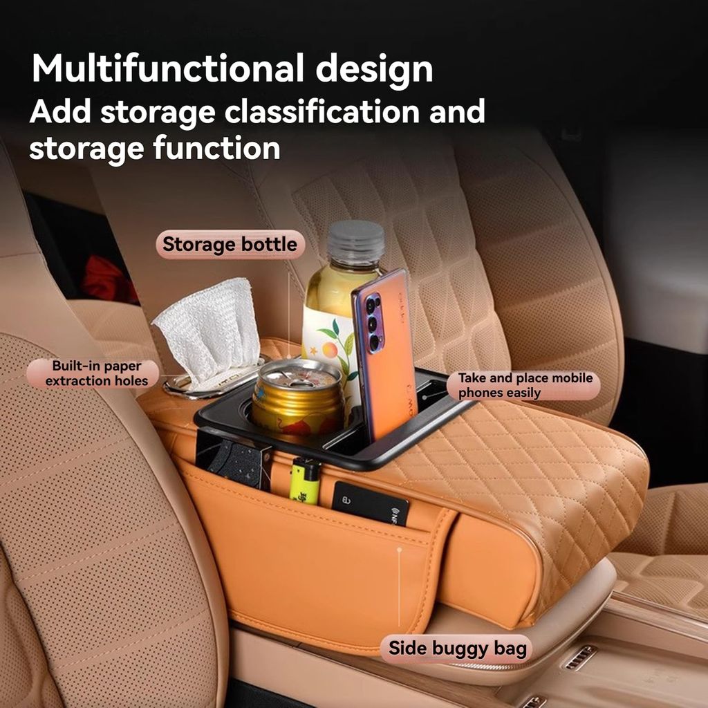 🔥Hot Seller🔥 COD!Multifunctional PU Leather Car Armrest Box Mat with Central Elbow, Universal 5-in-1 Car Center Console Cover, Leather Car Armrest Storage Box with Cup Holder, Tissue Box,Phone Holder (Orange)
