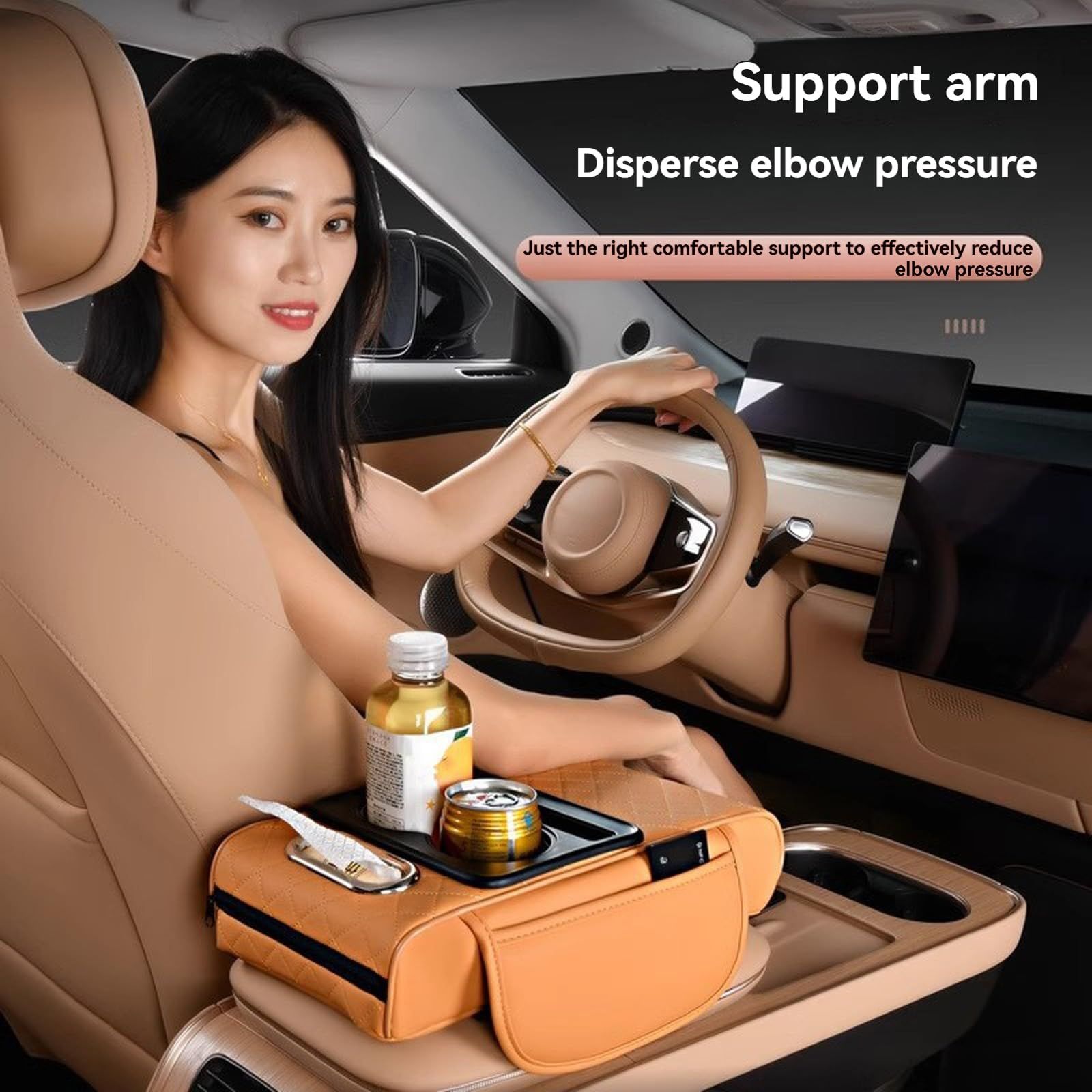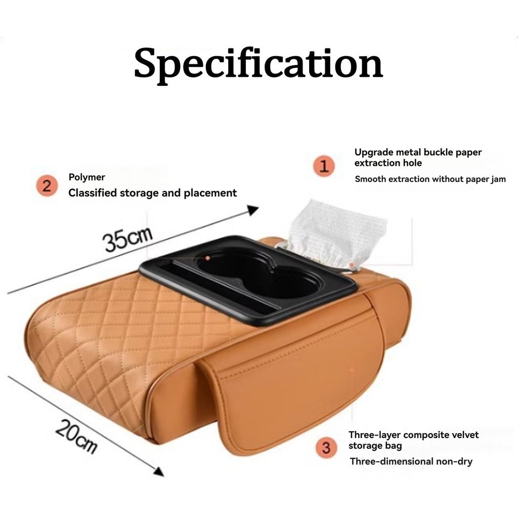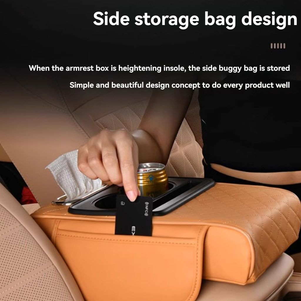 🔥Hot Seller🔥 COD!Multifunctional PU Leather Car Armrest Box Mat with Central Elbow, Universal 5-in-1 Car Center Console Cover, Leather Car Armrest Storage Box with Cup Holder, Tissue Box,Phone Holder (Orange)